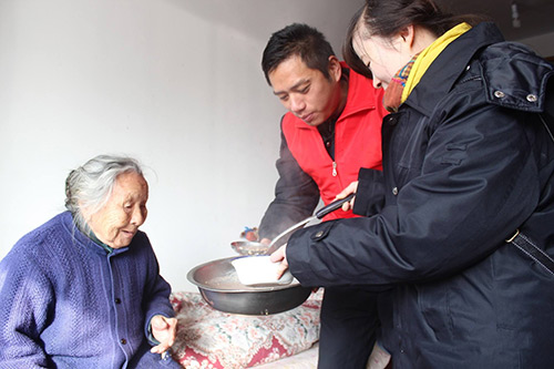 志愿者為老人奉送愛(ài)心粥